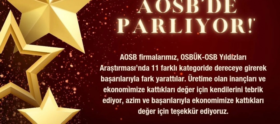 Organize Sanayi Bölgeleri Üst Kuruluşu (OSBÜK) tarafından düzenlenen ve Türkiye’nin en başarılı organize sanayi bölgesi firmalarını belirleyen OSB Yıldızları Araştırması’nda Adana Hacı Sabancı Organize Sanayi Bölgesi (AOSB) firmaları 11 kategoride ödül aldı. Gerek üretim gerekse ihracat kategorilerinde başarılarıyla dikkat çeken firmalar, AOSB’nin Türkiye’nin sanayi gücündeki rolünü bir kez daha gözler önüne serdi.