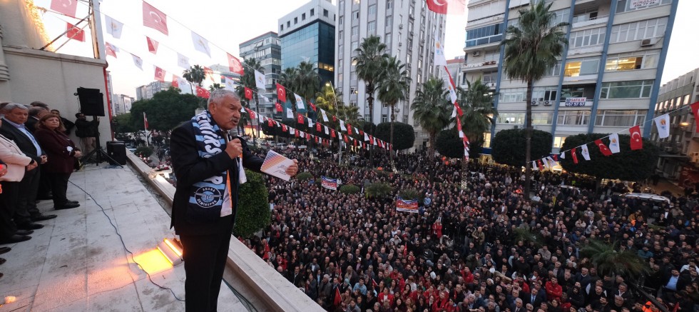 Adana Büyükşehir Belediye Binası önünde toplanan 10 bin Adanalıya hitap eden Başkan Zeydan Karalar, “Hep beraber yeni ufuklara” mesajı verdi.