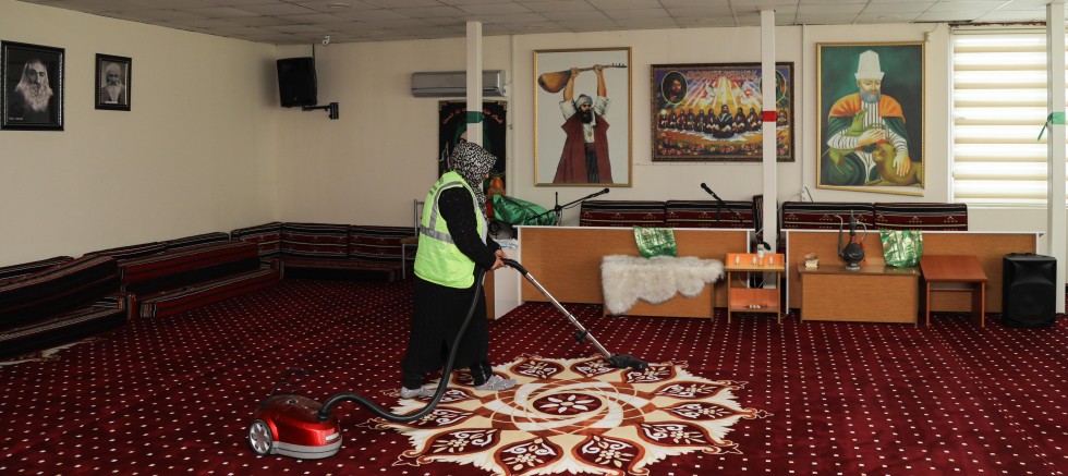 Günlük temizlik rutinleri olan ekipler, ibadethane temizliği kapsamında